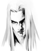 Simple ink sketch on plain colored background (with optional watercolor) OR black and white painted sketch